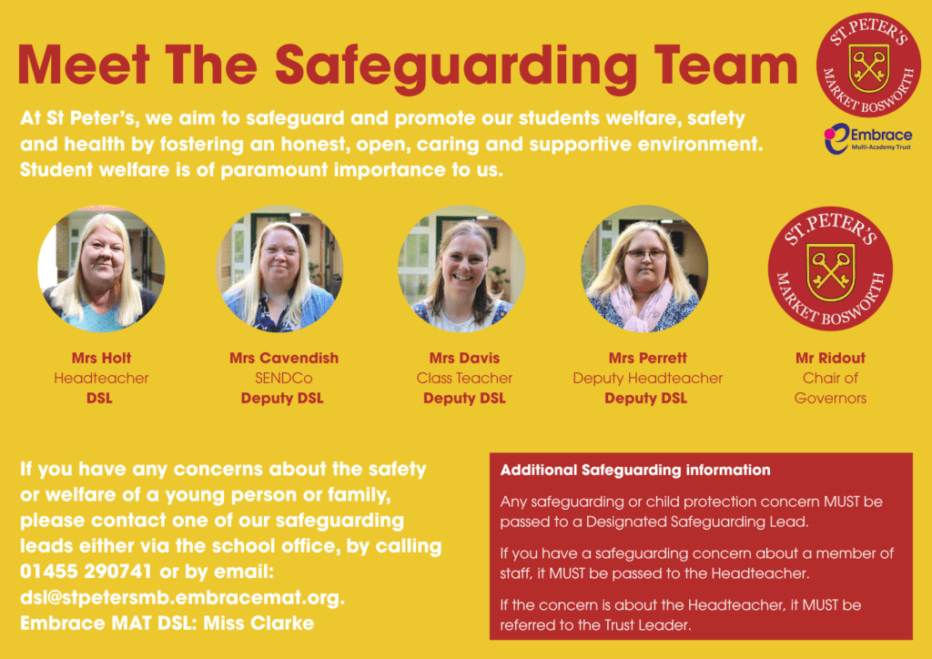 If you have any safeguarding concerns about a child please speak to Mrs Holt, Mrs Cavendish, Mrs Davis or Mrs Perrett on 01455 290741 or by email: dsl@stpetersmb.embracemat.org.